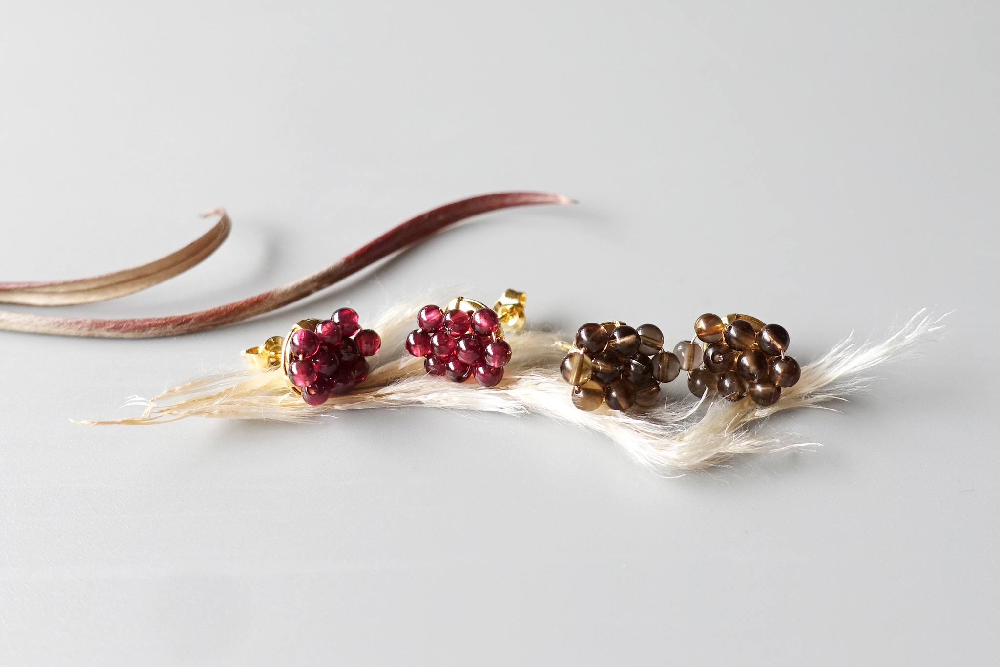 新作では、ゴールドをベースに、大理石、スモーキークォーツ、ガーネットなど色味に変化をつけてみました。