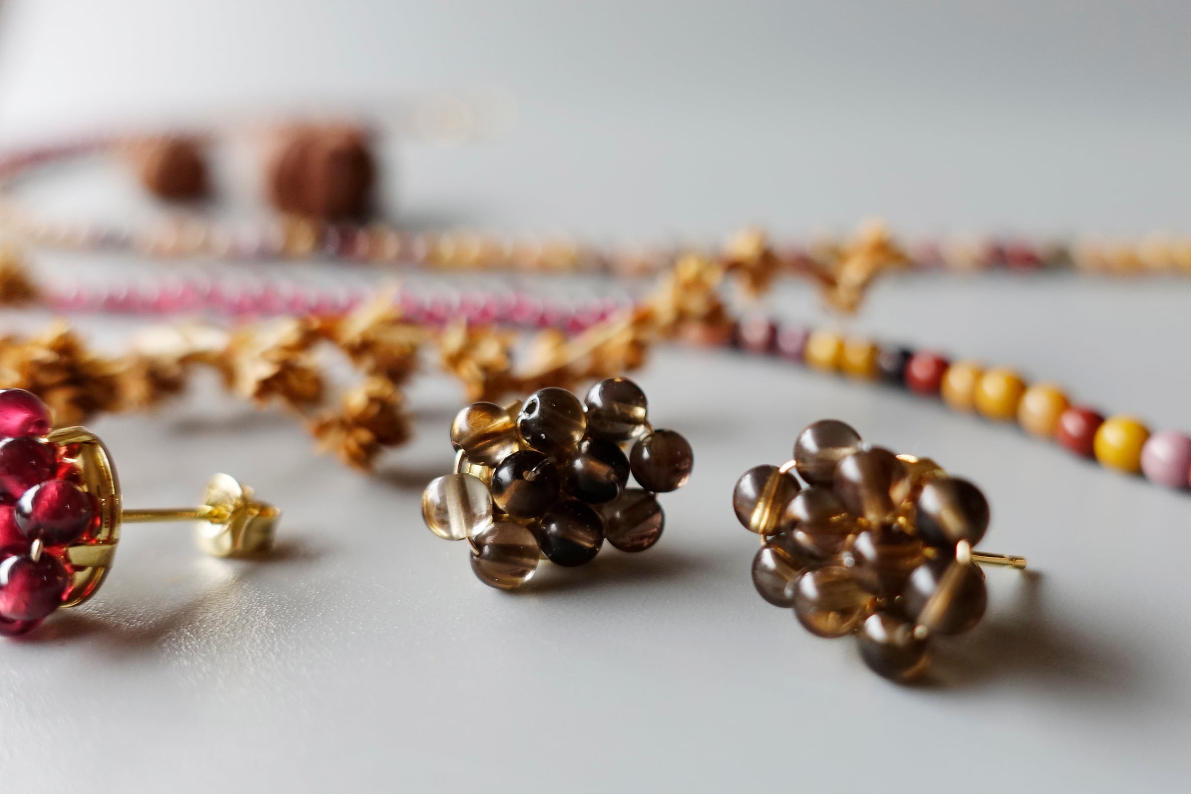 スモーキークォーツを小さな種に見立て編み込んだピアスです。