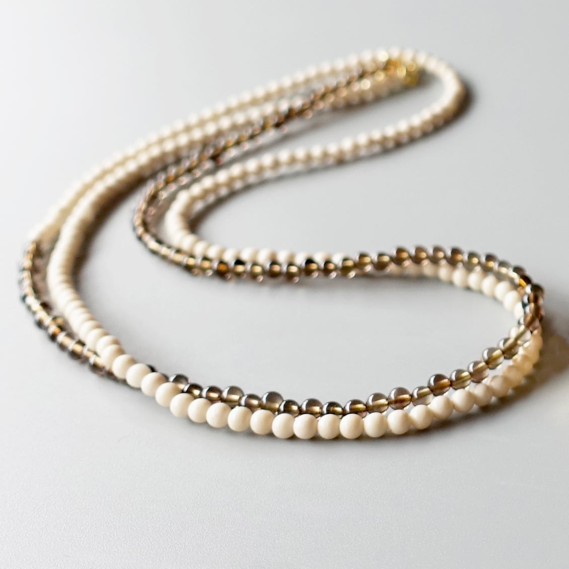 小さな種を思わせるビーズを、左右で異なる表情に組み合わせたアシンメトリーのロングネックレス。