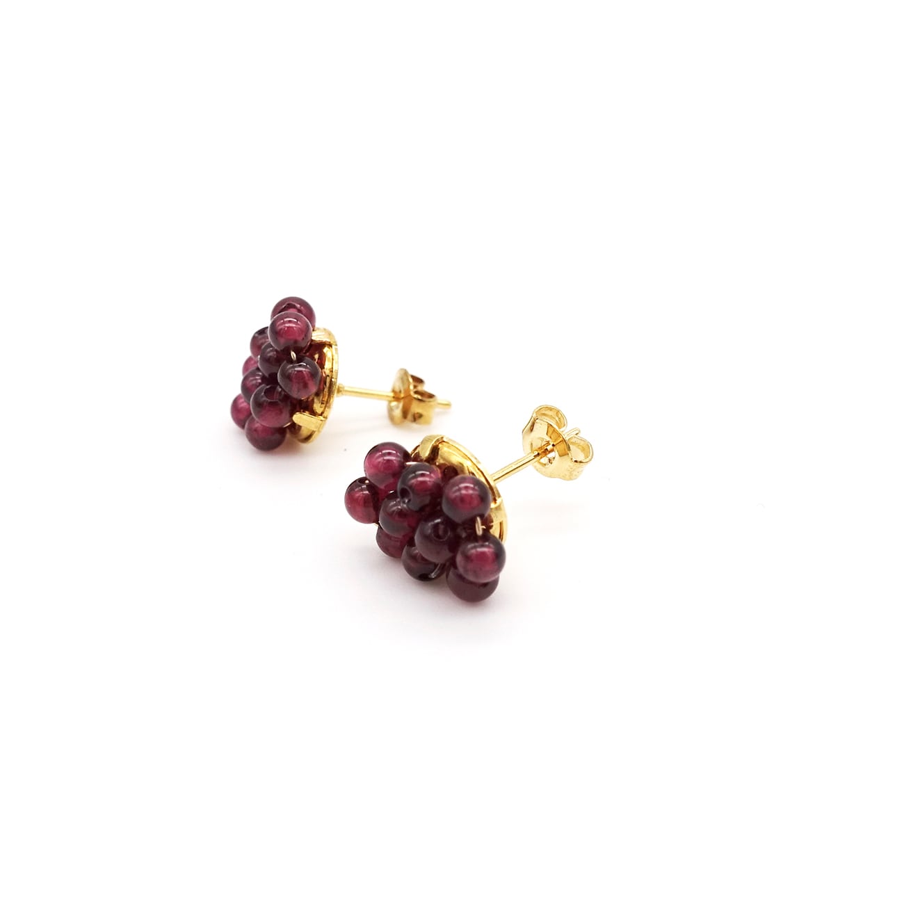 真紅のきらめきを閉じ込めたガーネットを、小さな「種」のようにぎゅっと束ねたピアス。